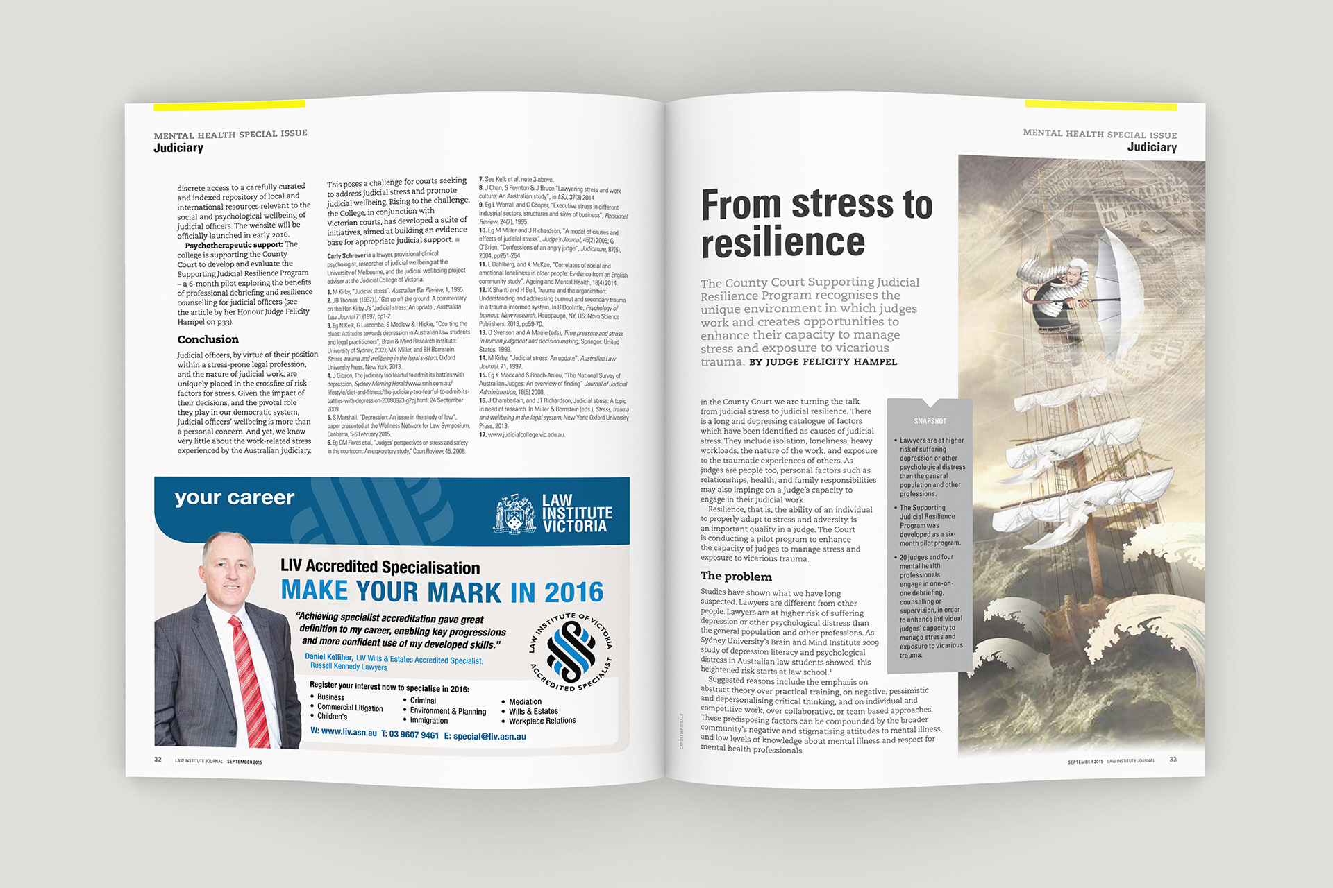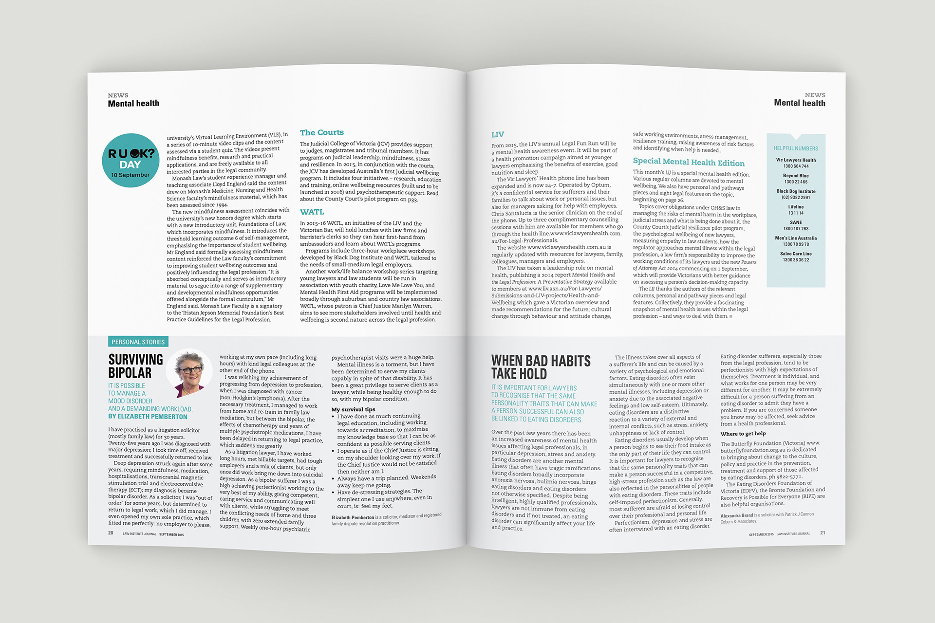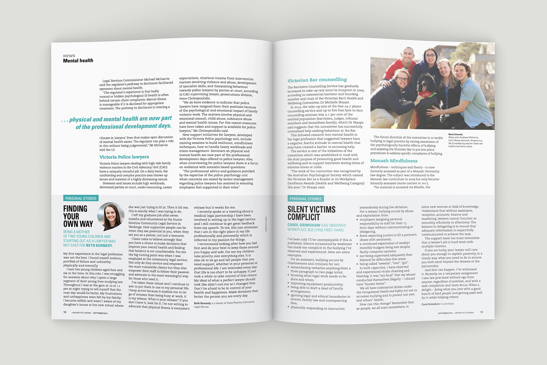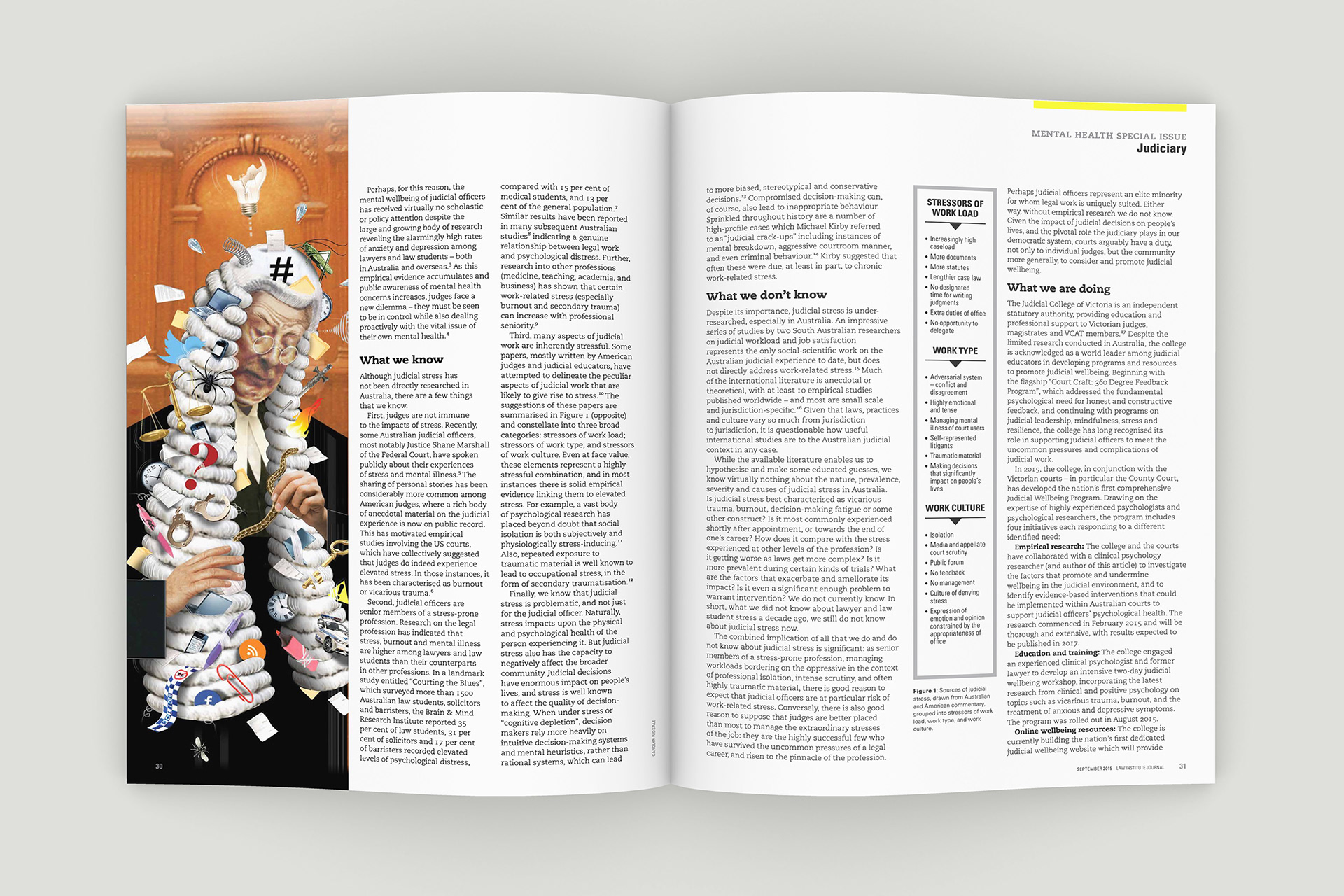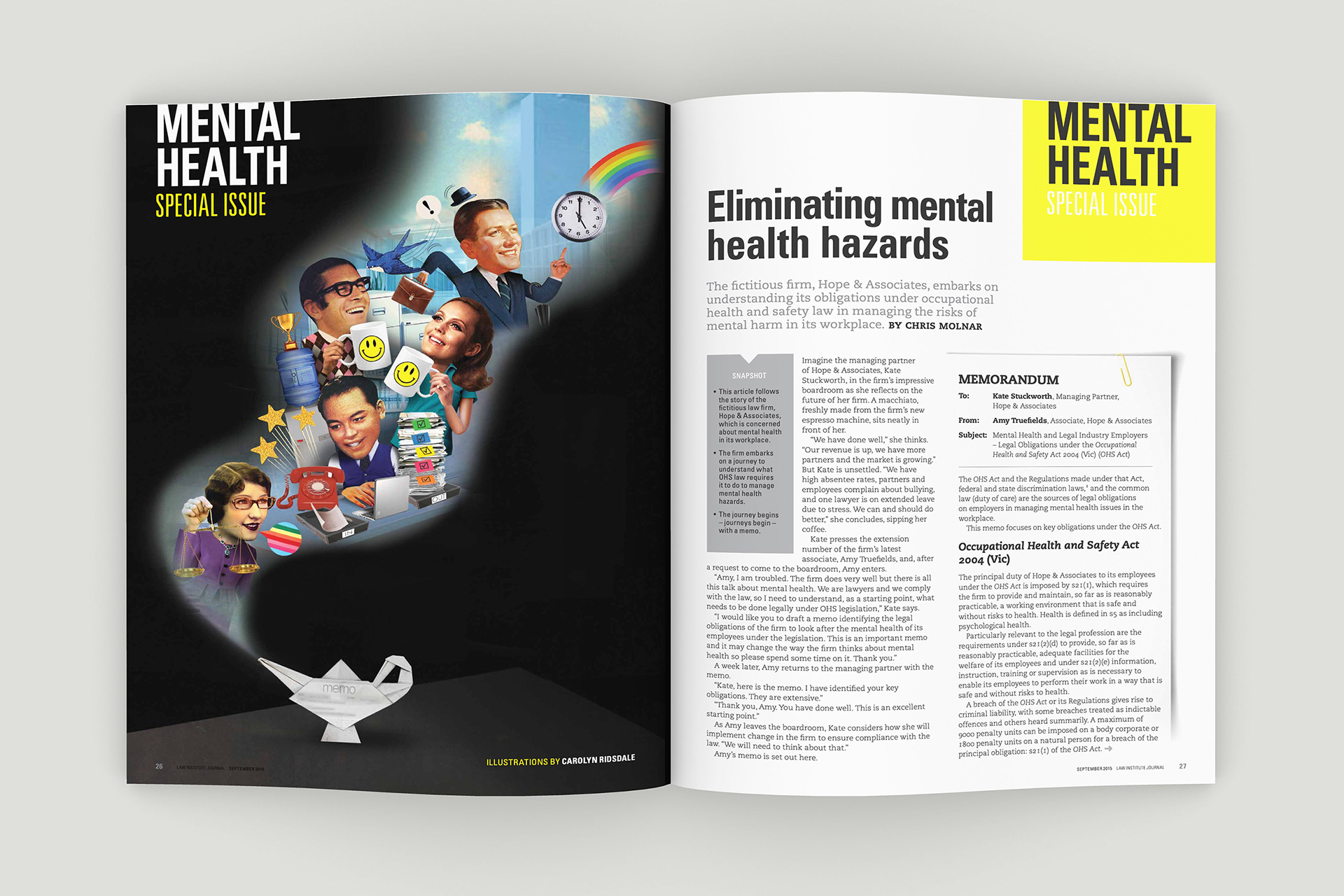 Design of the Law Institute Journal's special edition on mental health in the legal profession. Photography by Peter Glenane. Illustrations by Carolyn Ridsdale.