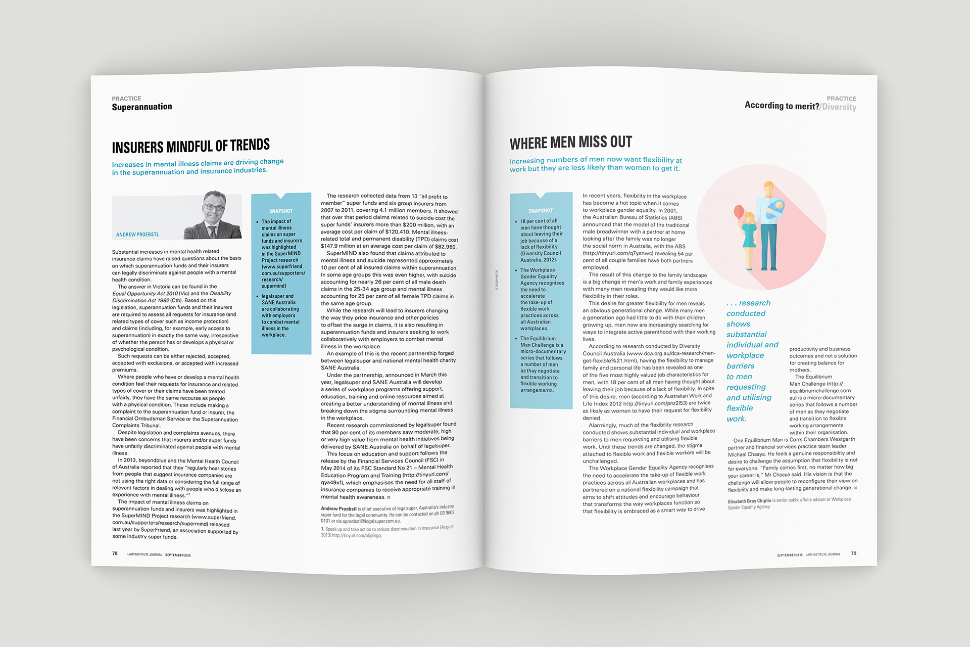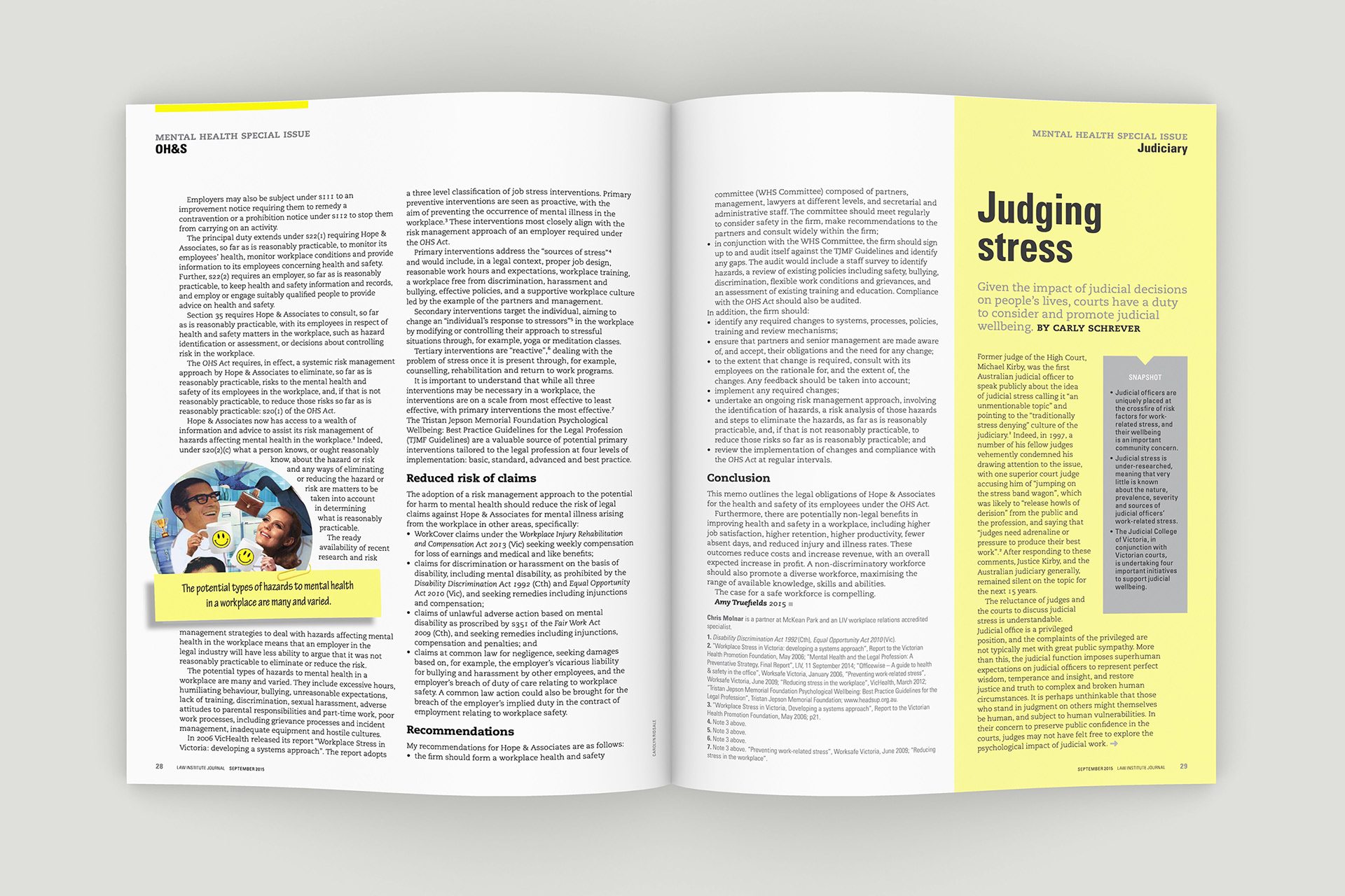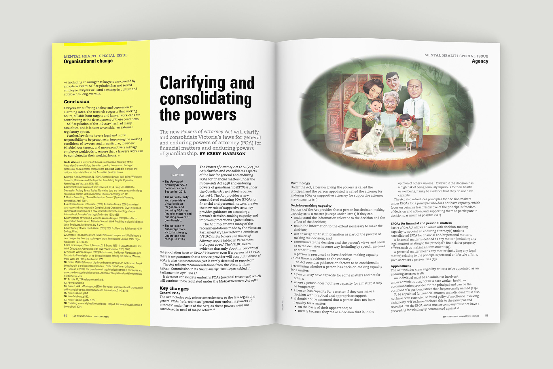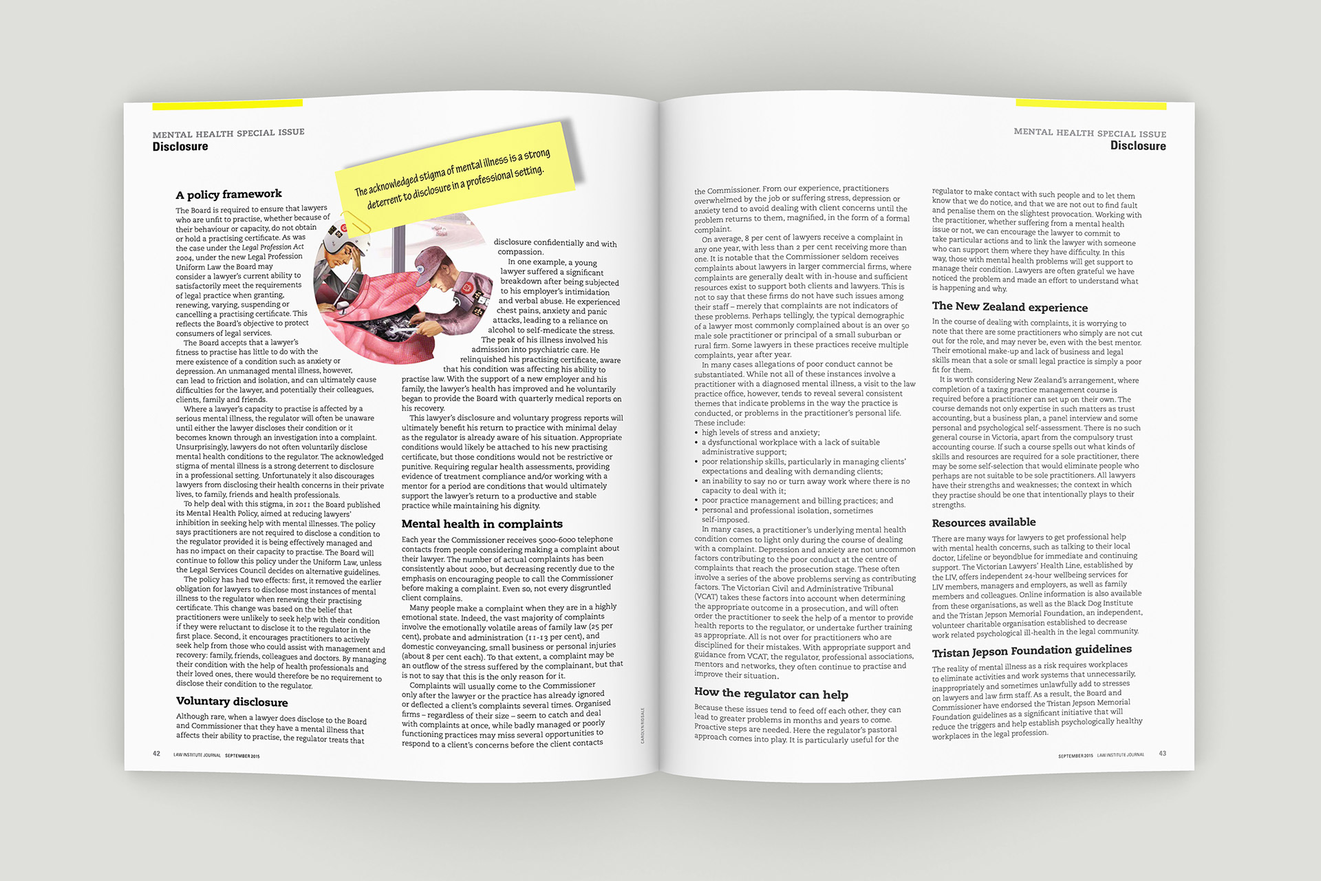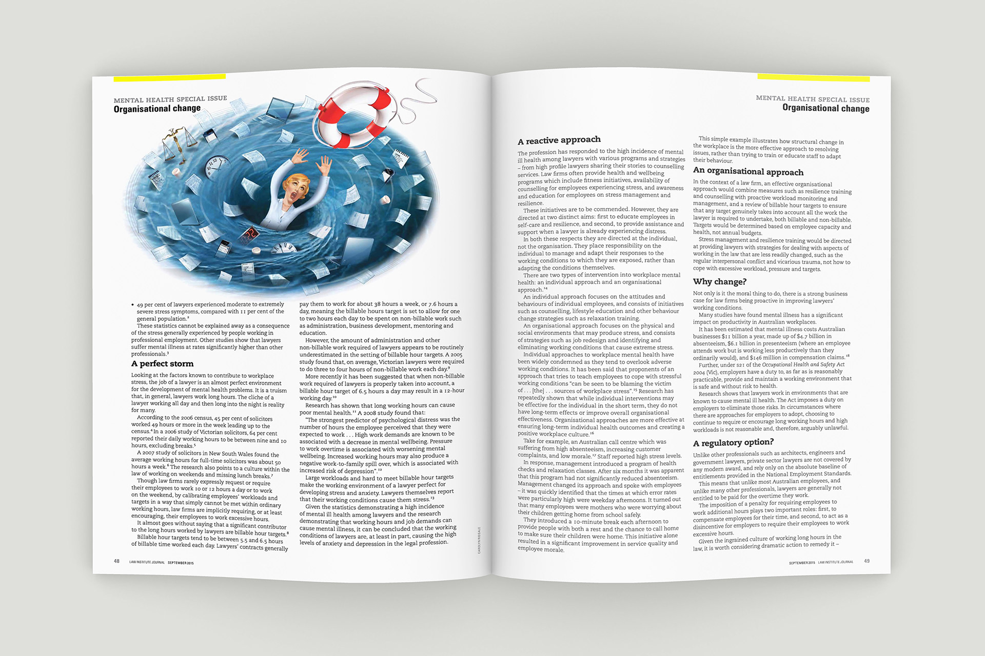 Design of the Law Institute Journal's special edition on mental health in the legal profession. Photography by Peter Glenane. Illustrations by Carolyn Ridsdale.