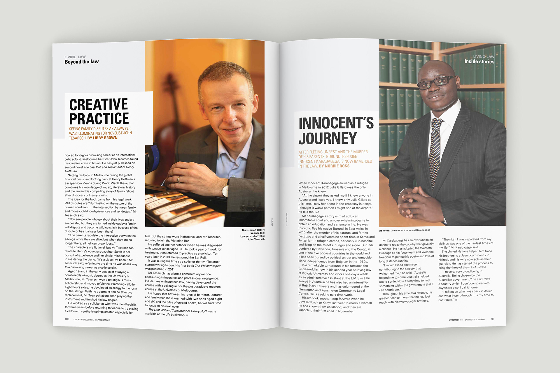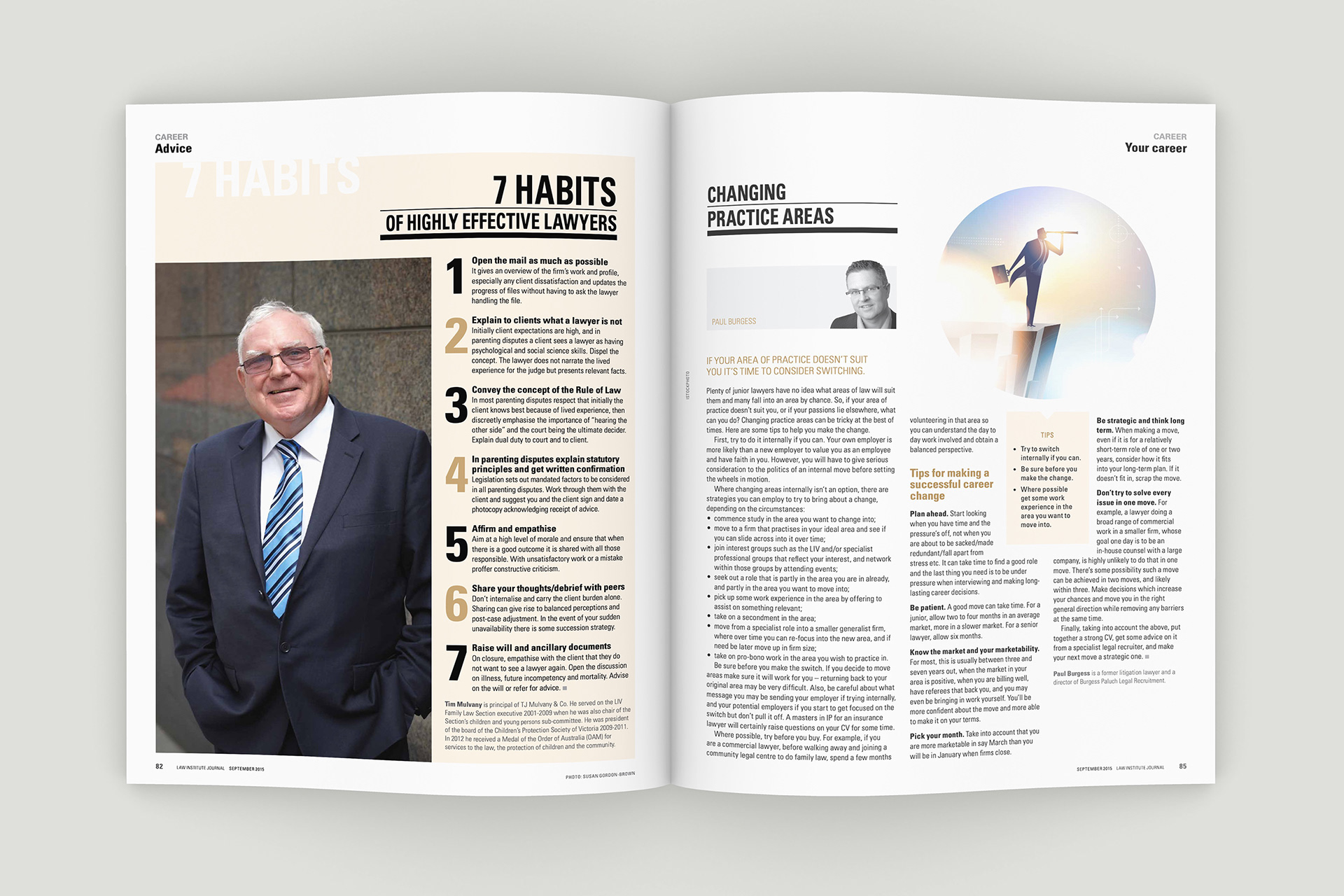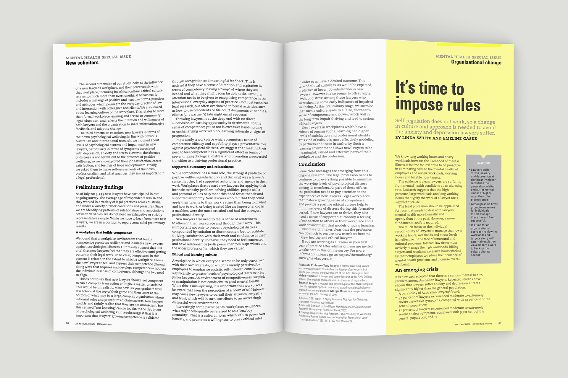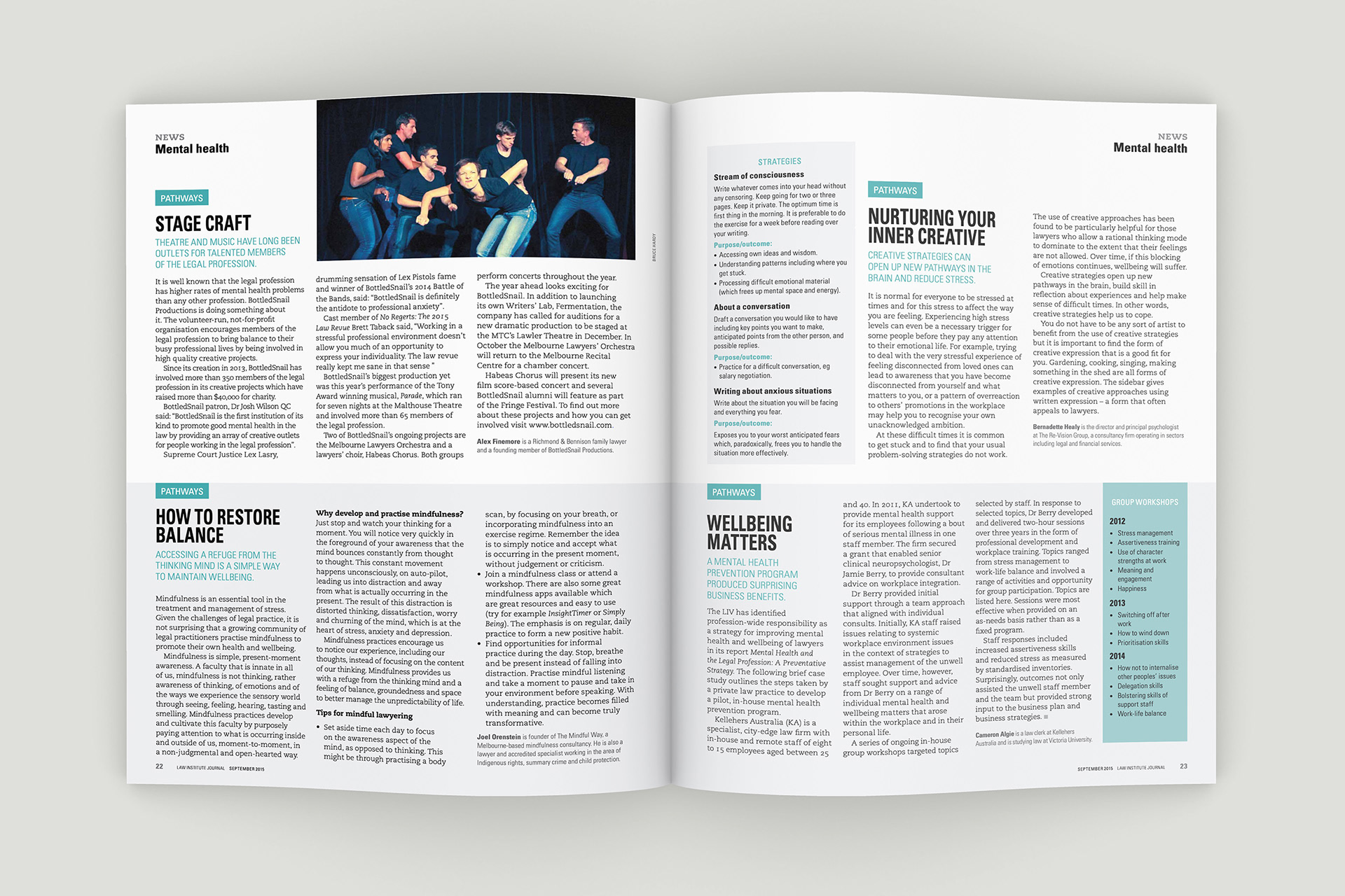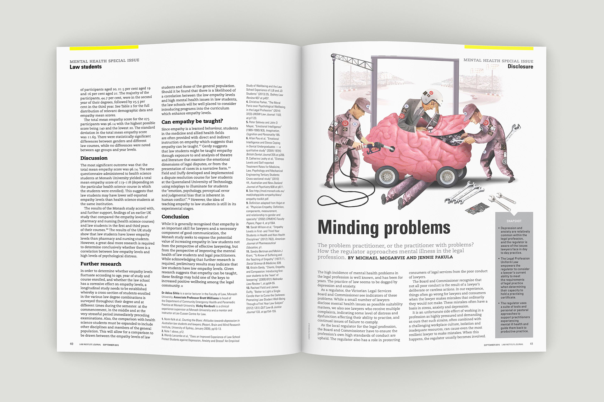 Design of the Law Institute Journal's special edition on mental health in the legal profession. Photography by Peter Glenane. Illustrations by Carolyn Ridsdale.